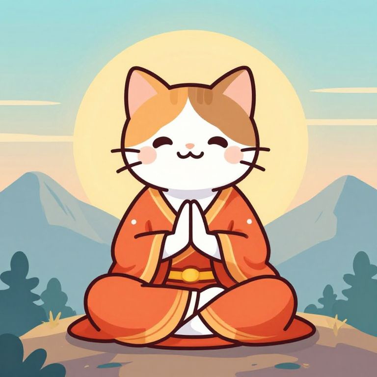 "Futurism a cute happy cat, wearing spiritual dress, meditating on the mountain, professional color grading, no contrast,vector design, ar 2:3,"