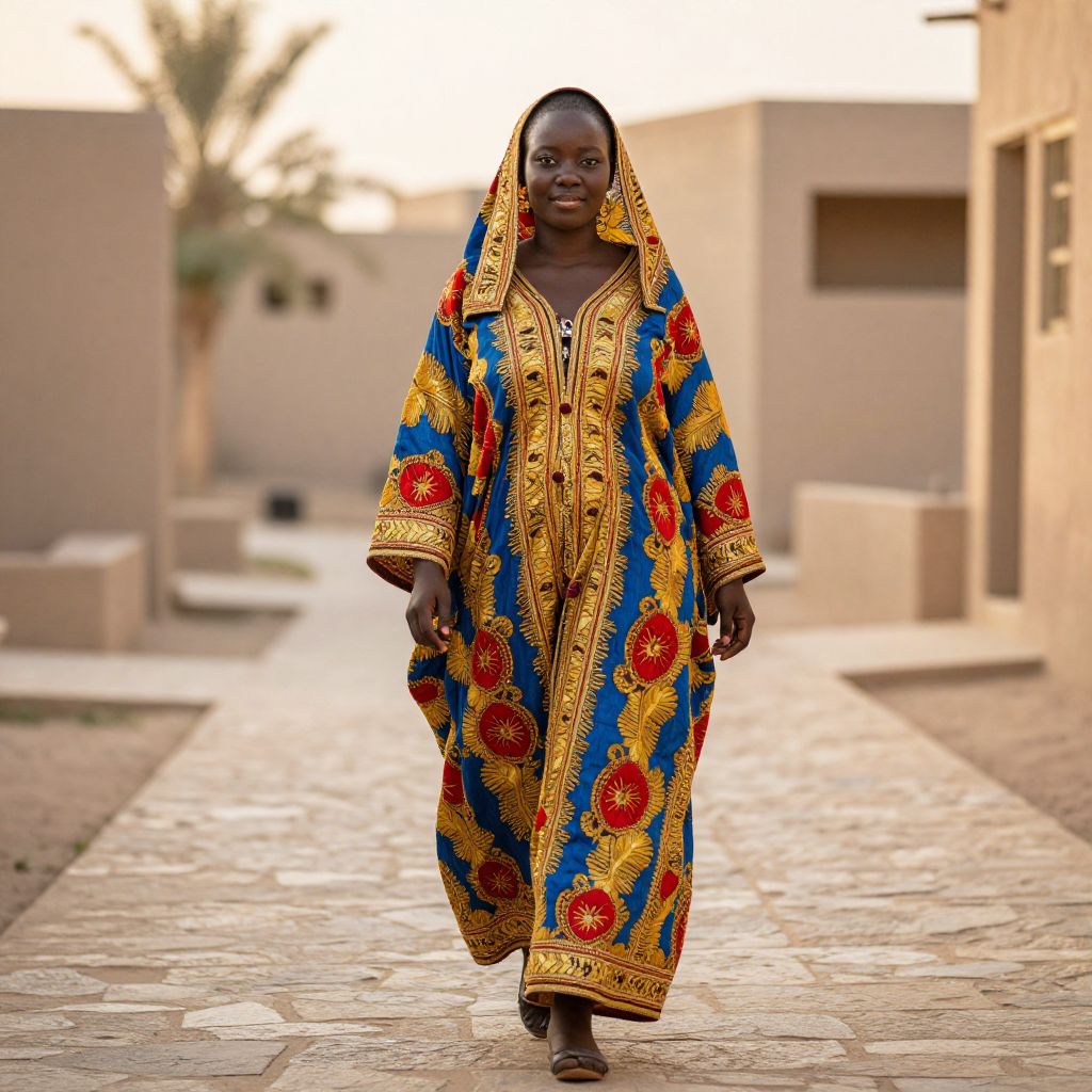 Photograph of a Black woman standing on a stone pathway in a sunlit courtyard. She wears an ornate, floor-length blue and yellow dress adorned with vibrant red floral patterns and gold embroidery. The dress has a hood that partially covers her head. She has a serious expression and stands with her hands by her sides. The background features beige, adobe-style buildings with rectangular windows and a blurred palm tree. The pathway is paved with irregularly shaped stones, adding texture to the scene. The overall style is traditional African, with rich, colorful textiles.