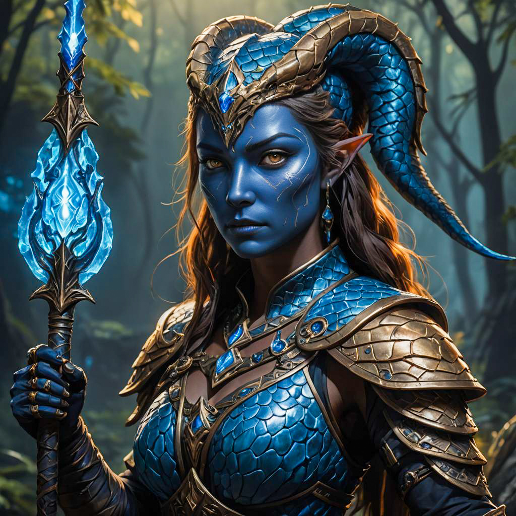 Detailed digital artwork of a female warrior character with a blue scaled, snake-human hybrid appearance. She has orange hair and curved horns, wearing intricate cerulean and gold-scaled armor. Holding a fiery enchanted spear, she stands in a mystical dark forest background with an intense, sinister gaze. The image showcases mythical fantasy elements, dramatic lighting, and high-resolution fantasy art style.