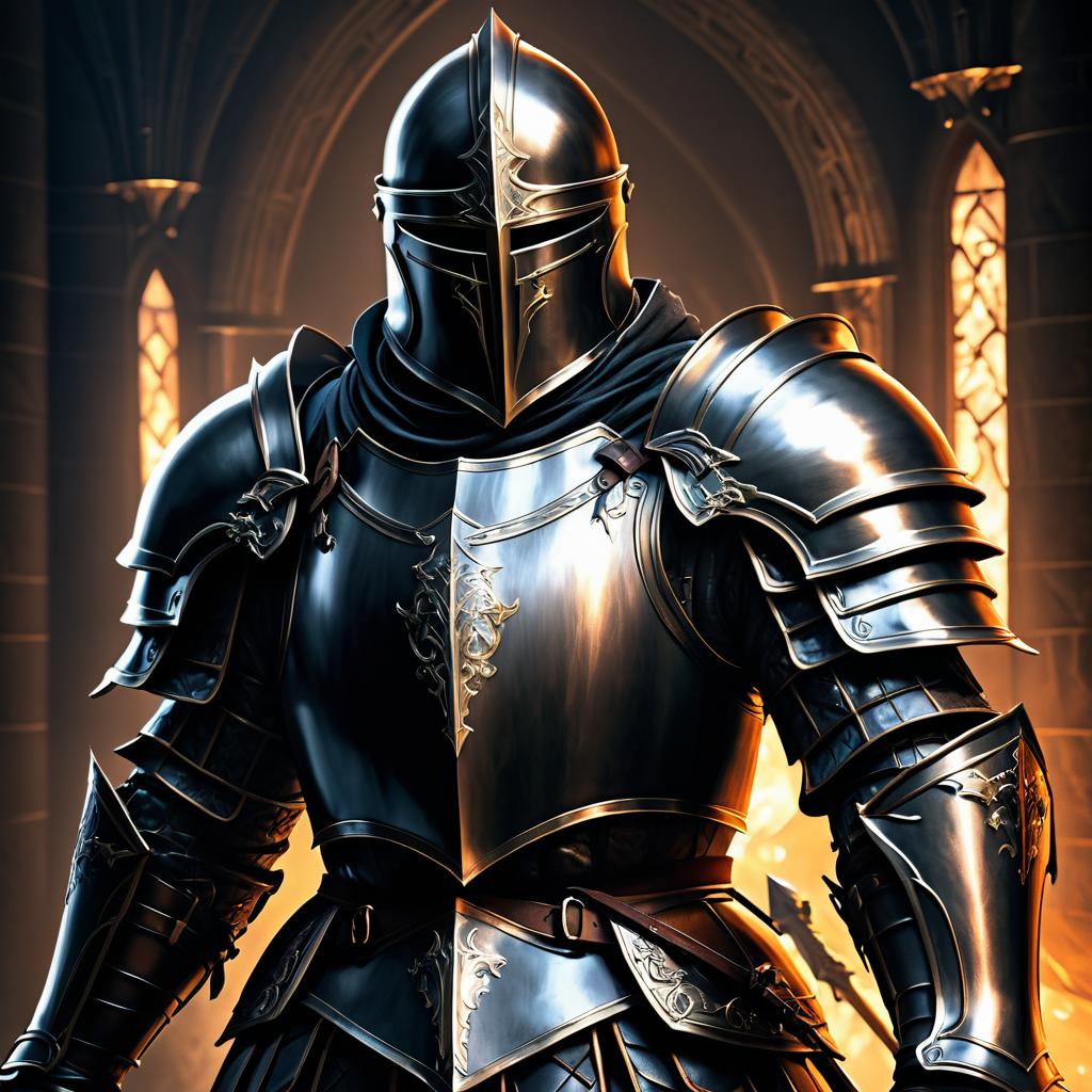 Fantasy illustration of a knight wearing highly detailed, ornate black and silver armor with a closed helmet, standing in a dimly lit, gothic cathedral-like environment. The knight holds a glowing sword, illuminated by cinematic lighting that highlights the intricate designs and textures of the armor, inspired by Dark Souls aesthetic.