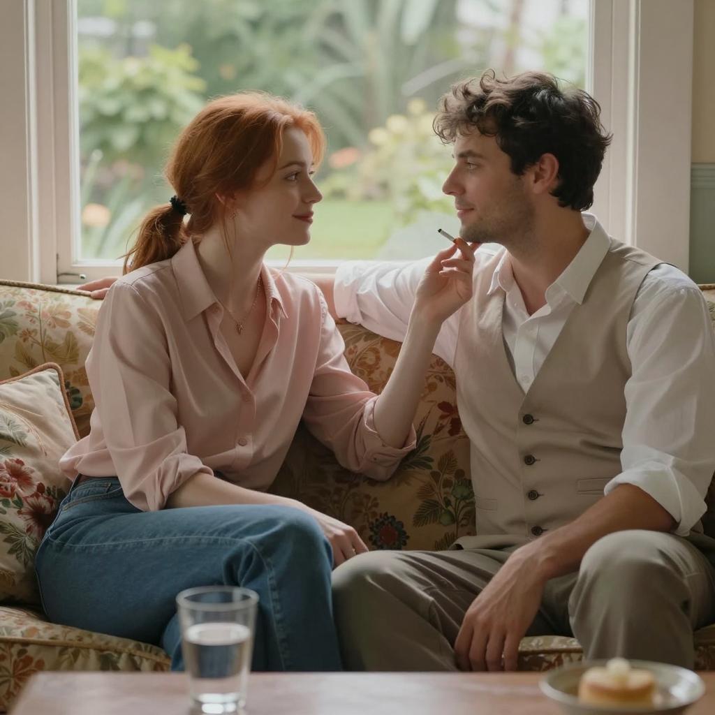 Man in black suit with white shirt and rose boutonniere sits on a chair, facing a woman in a yellow, patterned dress with puffed sleeves. Both lean in towards each other. Green plants in the background. Dimly lit table lamp on the right. Man's dark hair is slicked back. Woman's red hair is styled up. Woman's expression is intense, man's expression is focused. Two people.