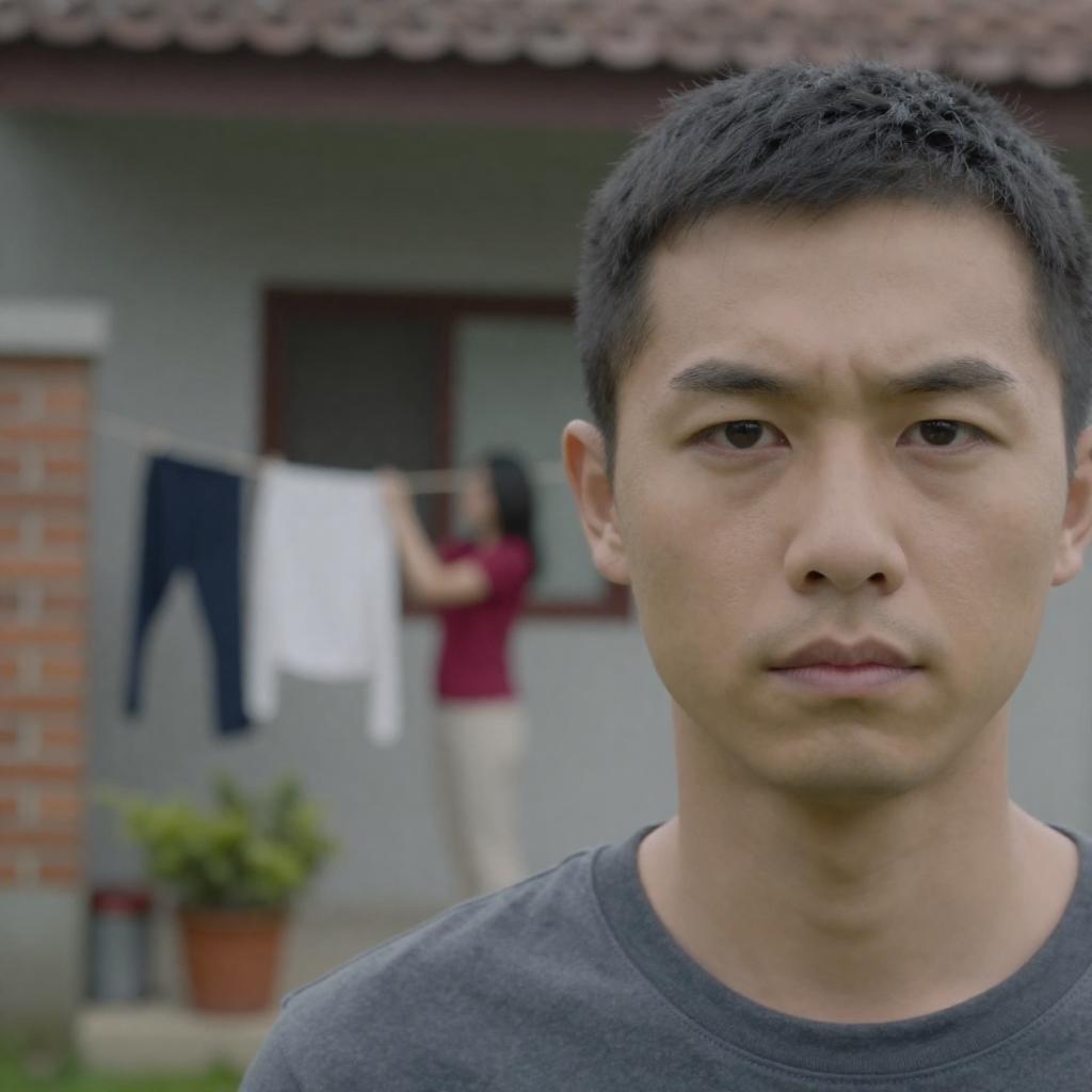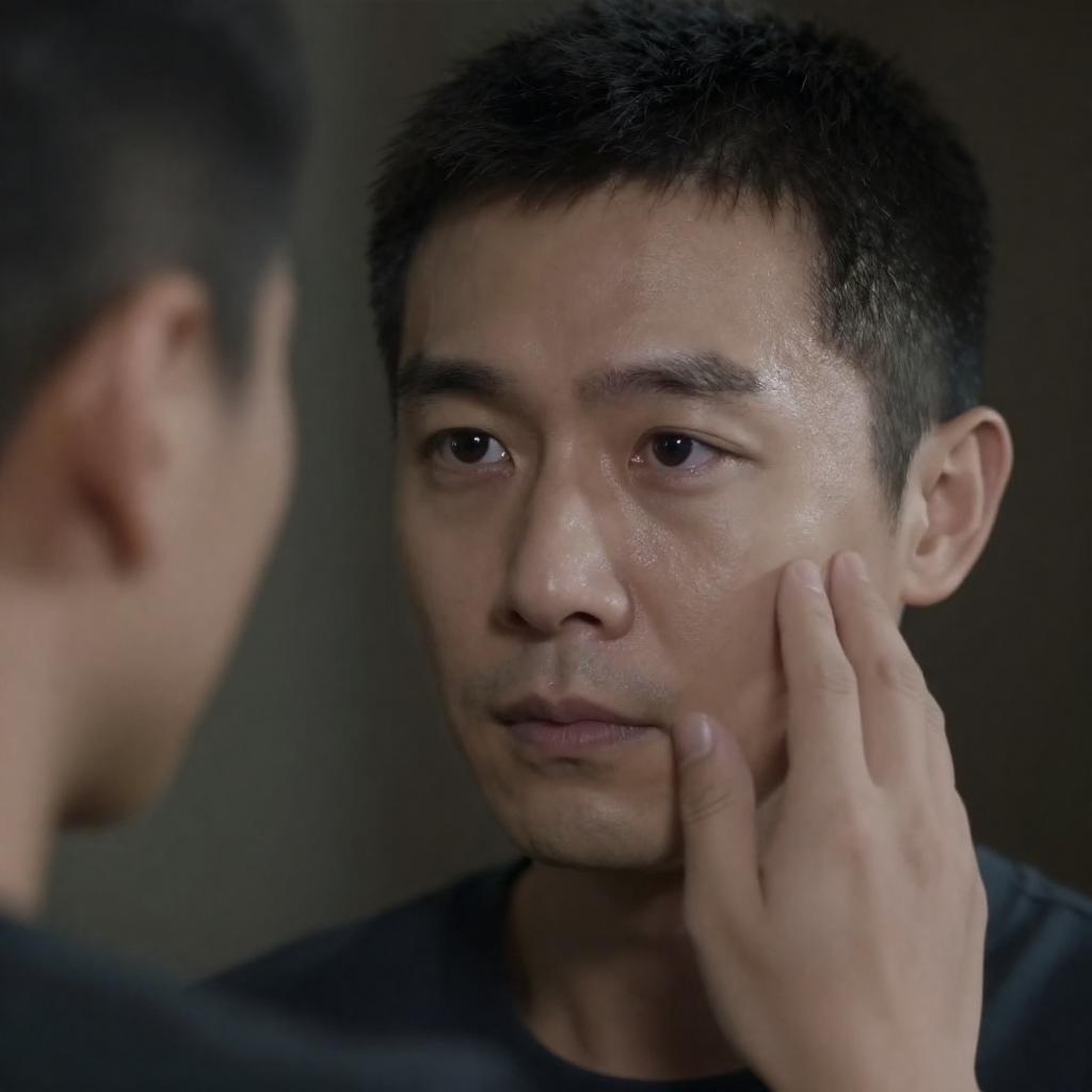 Close-up photograph of an East Asian man with short dark hair, serious expression, and slightly sweaty forehead. A hand gently touches his cheek from the right. Blurred dark background, dim lighting. Two people, focused on man's face.