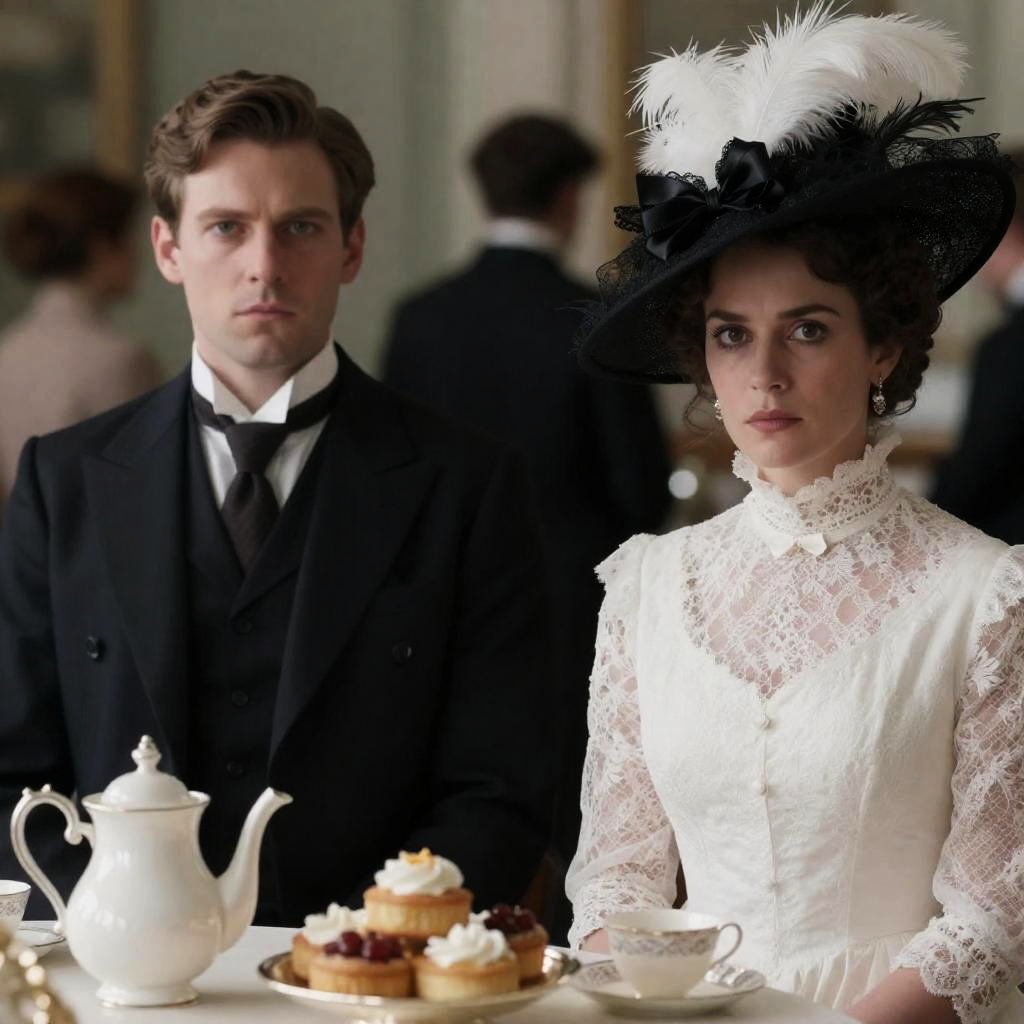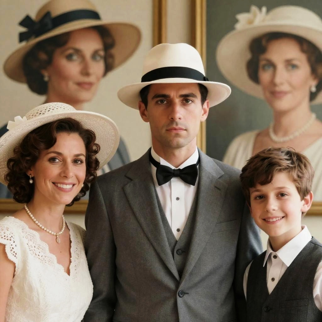 Photograph of three people in vintage attire. Man in center wears white fedora, gray suit, black bow tie, serious expression. Woman on left with curly brown hair, smiling, white lace hat. Boy on right, brown hair, gray vest, white shirt, smiling. Background features large portraits of same woman in hat and another woman in white hat. Light, warm tone.