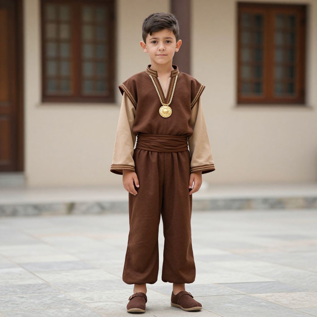 Photograph of a young boy with short black hair, wearing a brown and beige traditional outfit, gold necklace, and brown sandals, standing in front of