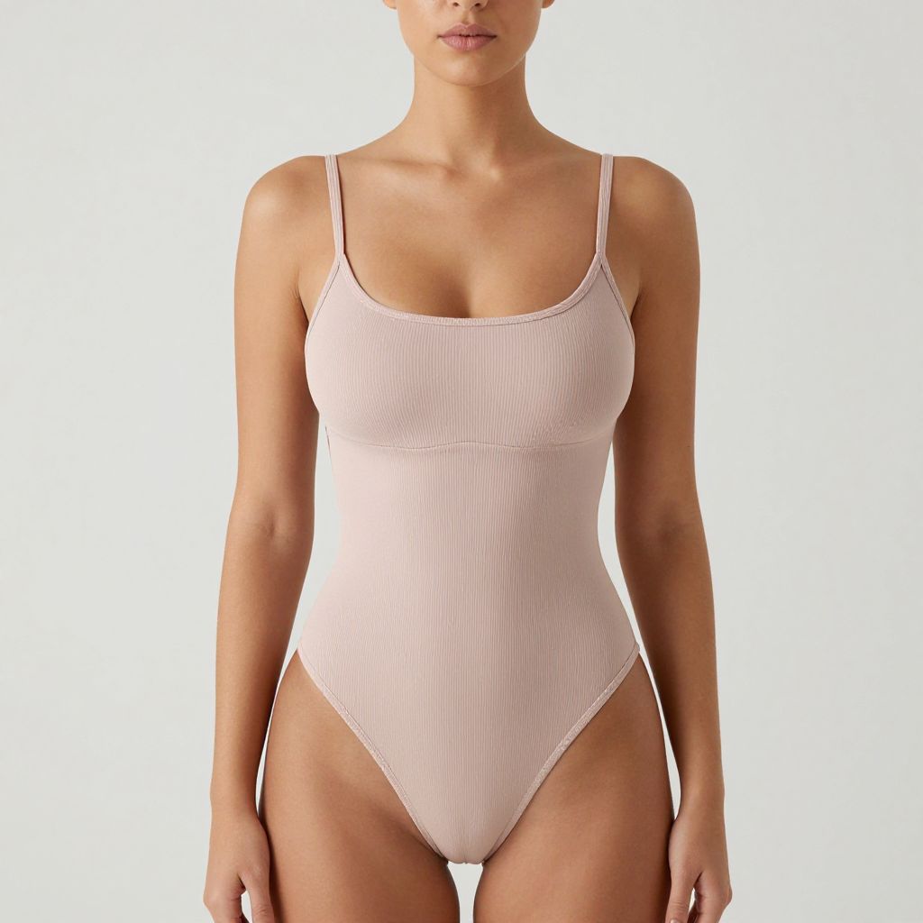Woman, minimalist, ribbed bodysuit in blush pink, thin straps, square neckline with a subtle central notch, seam details across the bodice, high-cut legs, plain background. Sexy. Pretty face and beаutiful eyes. Big breasts.
