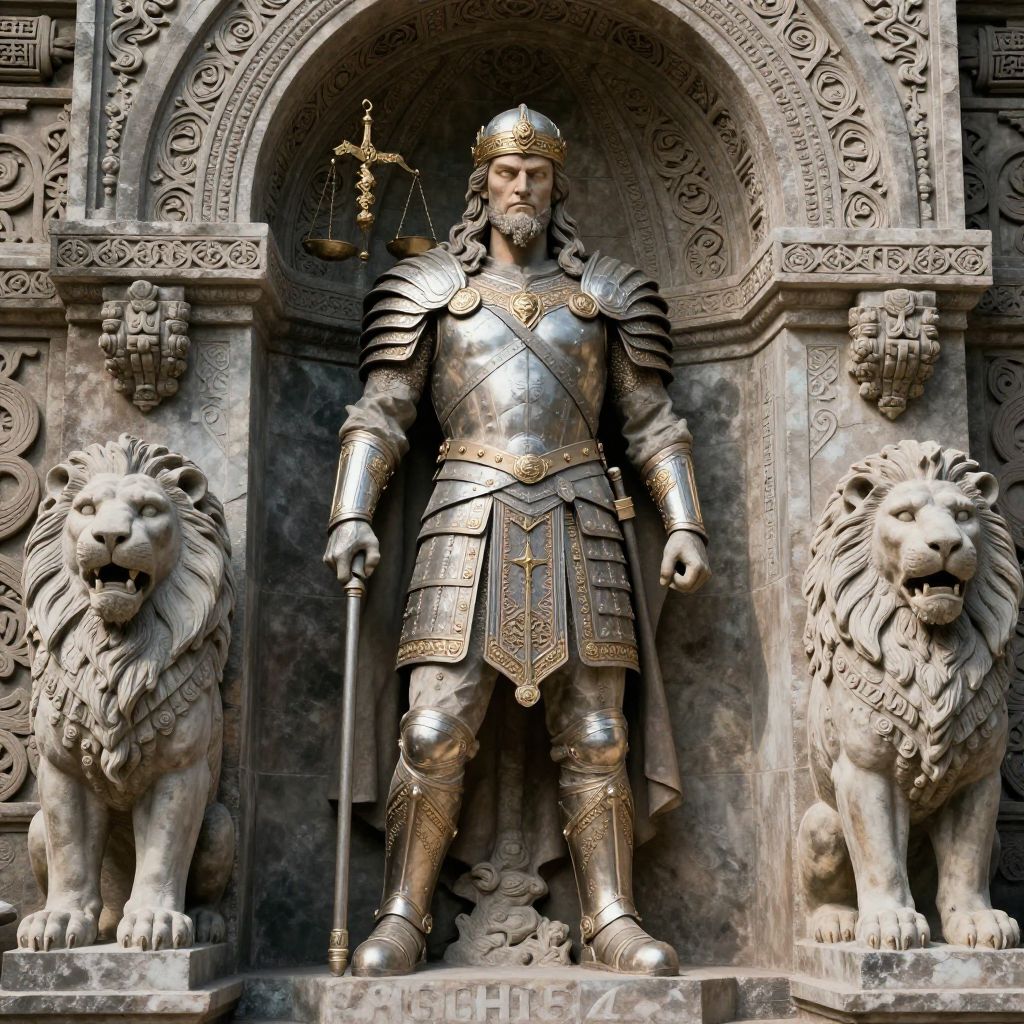 Photograph of a grand, intricately carved stone statue of a male warrior in full medieval armor, standing in a detailed archway. He holds a sword in his right hand and a balanced scale in his left. His armor is ornate, featuring intricate patterns and designs. Flanking him are two large, stone lion statues, each with a regal mane. The archway behind him is adorned with elaborate carvings and symmetrical patterns. The statue is in a greyish stone, with the lions' fur and the warrior's armor appearing metallic and reflective. The overall scene is majestic and historical.