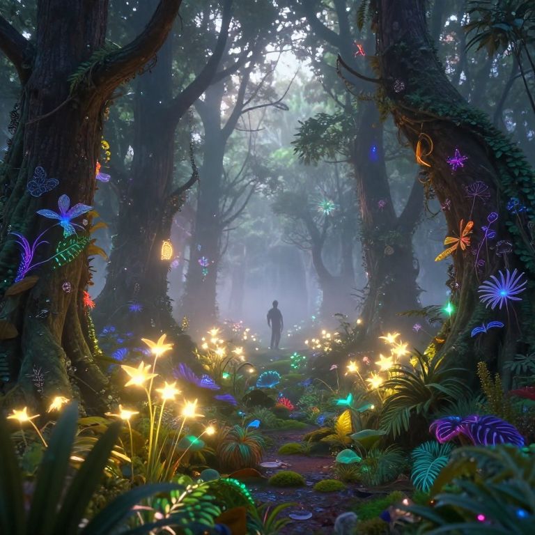 Beals in a mystical forest at dawn, surrounded by glowing plants and ethereal light, intricate details, fantasy style, soft mist enveloping the scene, vibrant color palette, cinematic atmosphere, highly detailed environment