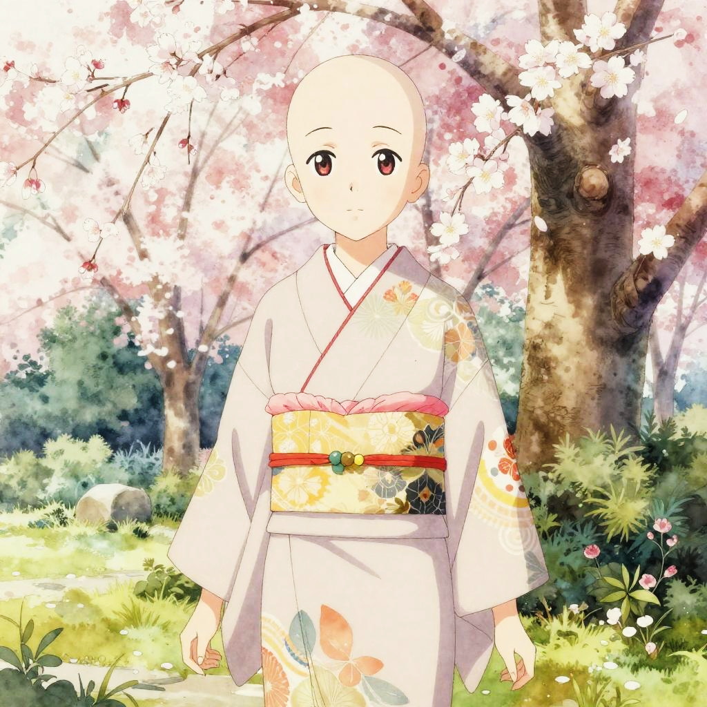Watercolor-style anime illustration of a bald young girl standing in a serene garden with cherry blossom trees in full bloom. She wears a traditional, patterned kimono with a yellow obi belt featuring intricate designs. The soft sunlight filters through the blossoms, creating a peaceful and calm atmosphere.