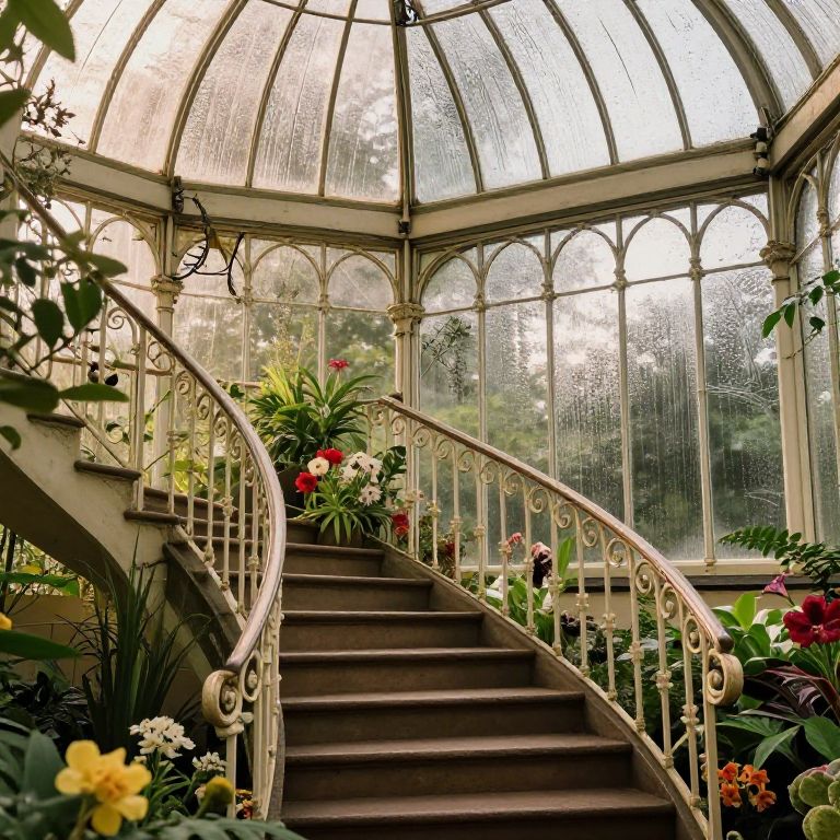 Rampe in a grand Victorian greenhouse, wrought iron handrails and curved glass panels covered in dew, exotic plants blooming around the staircase, soft warm sunlight filtering through, delicate vintage details, romantic and peaceful scene.