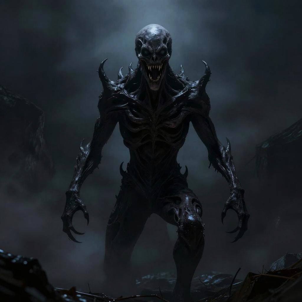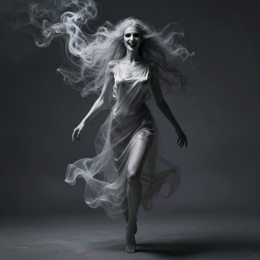 Full body, wispy, skeletal phantom wrapped in swirling mist, open mouth, sharp teeth, black eyes, gliding above ground, ghastly grin, shadow, icy blue frost