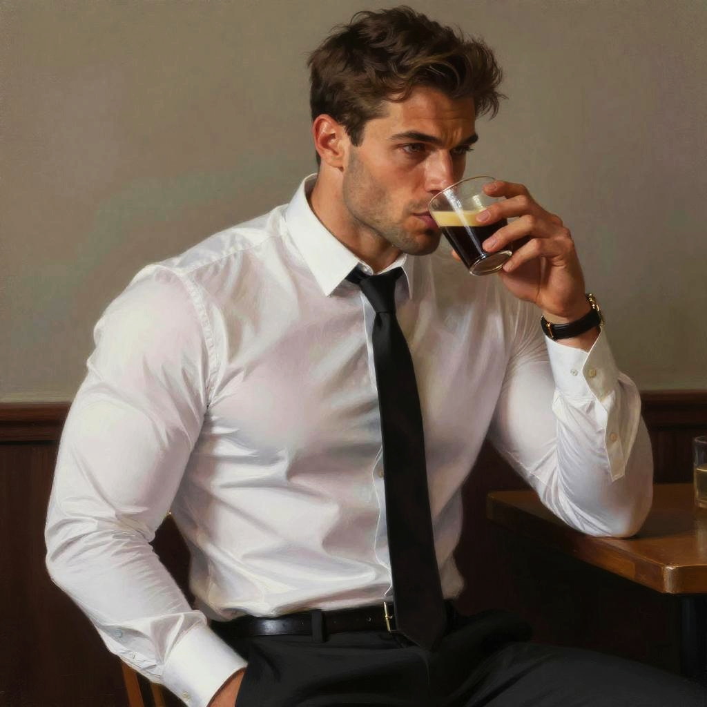 1man, a 30 y.o muscular male wearing long-sleeve white shirt and tie, drinking coffee, soft lighting, masterpiece, best quality, 8k uhd, dslr, film grain, Fujifilm XT3 photorealistic painting art by midjourney and greg rutkowski