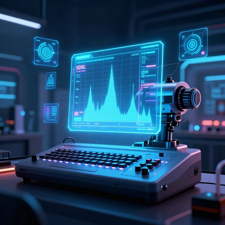 Concept art of the best sampler for SDXL as an advanced robotic instrument with holographic screens displaying sampling data, surrounded by floating algorithm icons, neon glow and dynamic lighting effects, immersive science fiction laboratory setting, photorealistic style