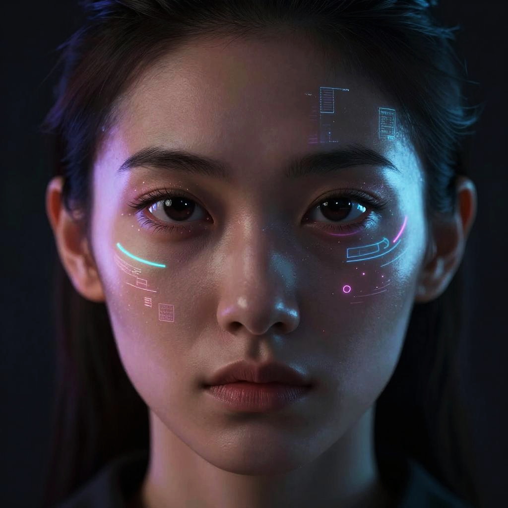 Futuristic black eye filter online concept art, a holographic display projecting a model's face with intensely darkened eyes, cyberpunk aesthetics, glowing digital particles, high contrast shadows, vivid neon highlights emphasizing the filter effect