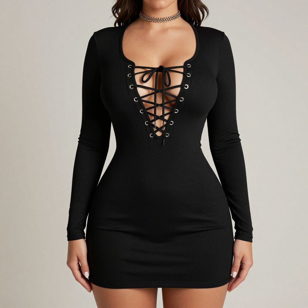 Photograph of a woman from the neck down, wearing a form-fitting, long-sleeved black ribbed mini dress with a deep V-neck lace-up design. The dress is secured with black laces that crisscross down the center, exposing a hint of cleavage. She has a choker necklace with a black ribbon pattern. Her skin tone is light, and she stands against a plain white background. The dress highlights her hourglass figure, with a narrow waist and flared hips. Her arms rest naturally by her sides.