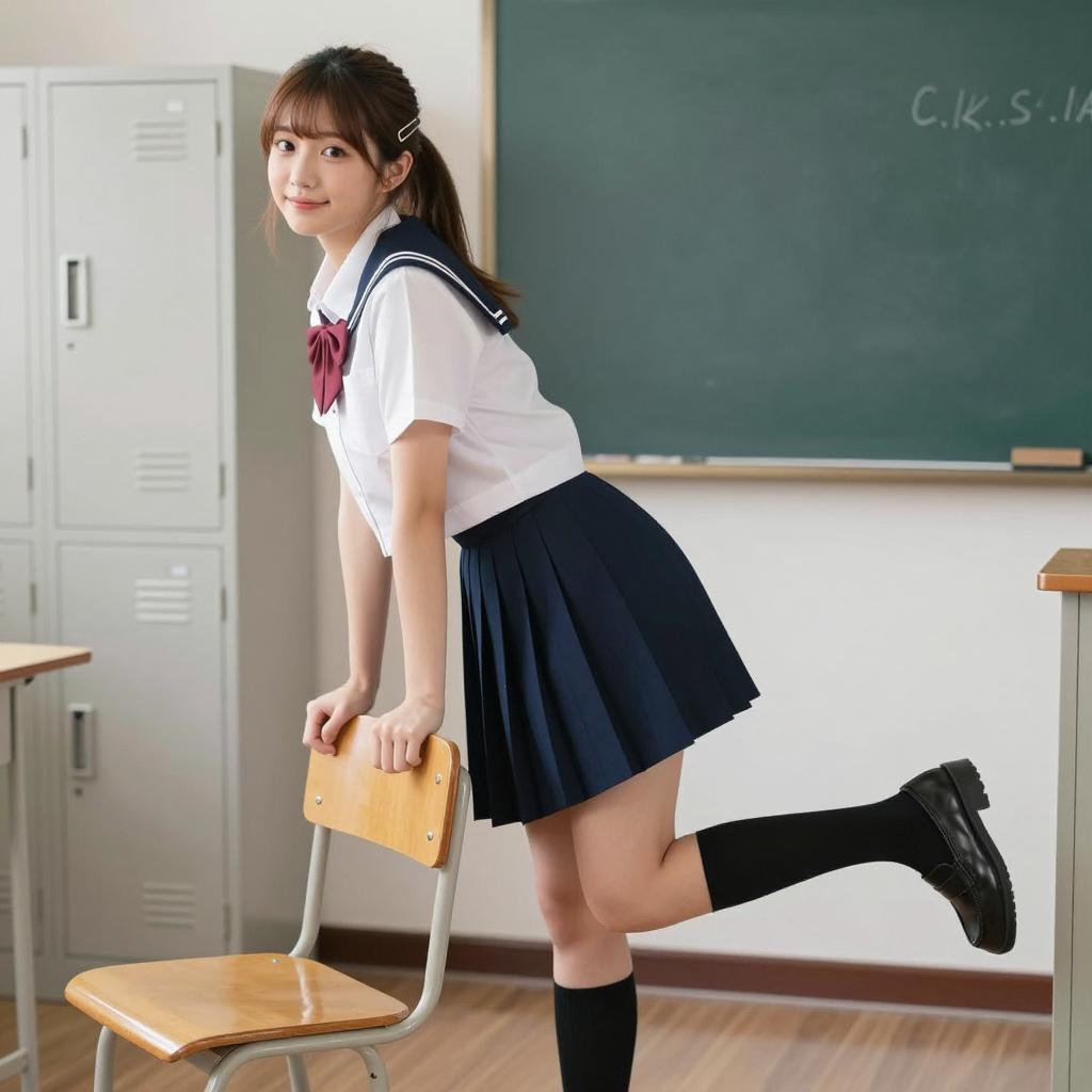Portrait of an Asian young woman with light brown hair and bangs, sitting on a tatami mat in a traditional Japanese classroom. She is dressed in a black school uniform with a white tie, black thigh-high socks, and a gray pleated skirt. The background features a green chalkboard and a wooden bench. She looks over her shoulder with a slight smile, illuminated by natural light.