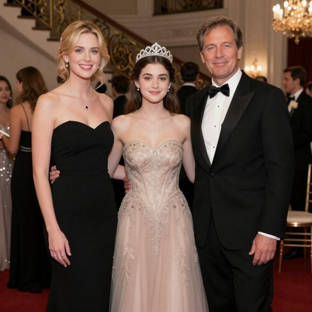 Photograph of a formal ball. Blonde woman in black strapless gown and necklace stands left, smiling. Young woman in silver tiara and beige strapless gown with intricate details stands center, smiling slightly. Man in black tuxedo with bow tie stands right, smiling. Background includes ornate staircase, chandelier, and other guests in black attire.