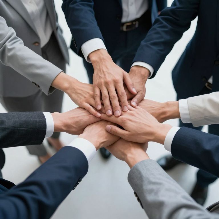 Photograph of six business professionals' hands, dressed in dark and light gray suits with white shirts, forming a tight circle and overlapping in the center. The hands are of varying skin tones, from light to medium. The background is blurred and white, emphasizing the unity and cooperation symbolized by the hands. The image conveys teamwork and collaboration, with a modern, professional office setting implied by the attire. The hands are centered, with fingers gently pressing together.