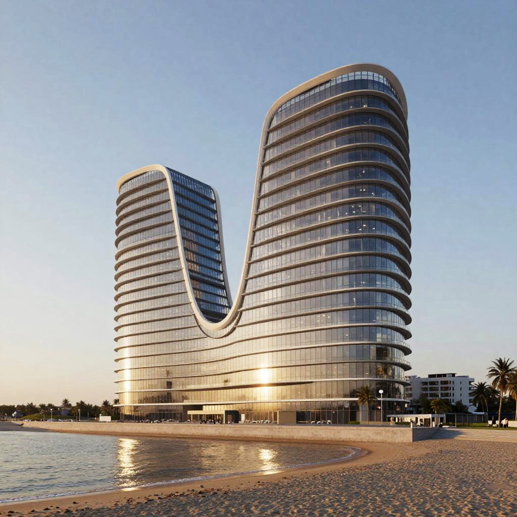 Photo-realistic rendering of a modern curved glass building with a distinctive U-shaped design, situated near a sandy beach. The building features a sleek glass facade reflecting the warm light of the sunset, embodying contemporary architectural style influenced by Zaha Hadid and David Chipperfield. The scene includes a clear sky and calm water, emphasizing the serene coastal ambiance.