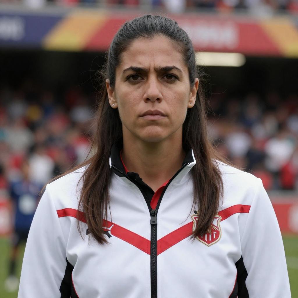 Photograph of a serious-looking woman with medium brown skin and long, dark hair pulled back, wearing a white and black sports jacket with red accents. She stands in front of a blurred crowd in a stadium, with bright lights and colorful banners in the background. Her expression is focused and determined.