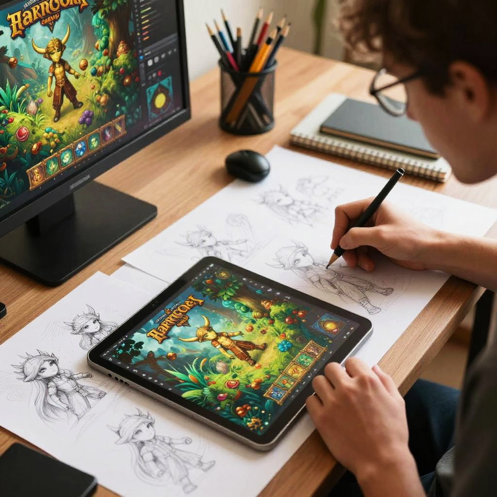 A game cover art maker workspace filled with colorful sketches and digital tablets, showcasing an imaginative artist crafting fantasy-themed game covers, intricate character designs and lush backgrounds, ambient lighting, and a creative atmosphere full of inspiration and innovation.