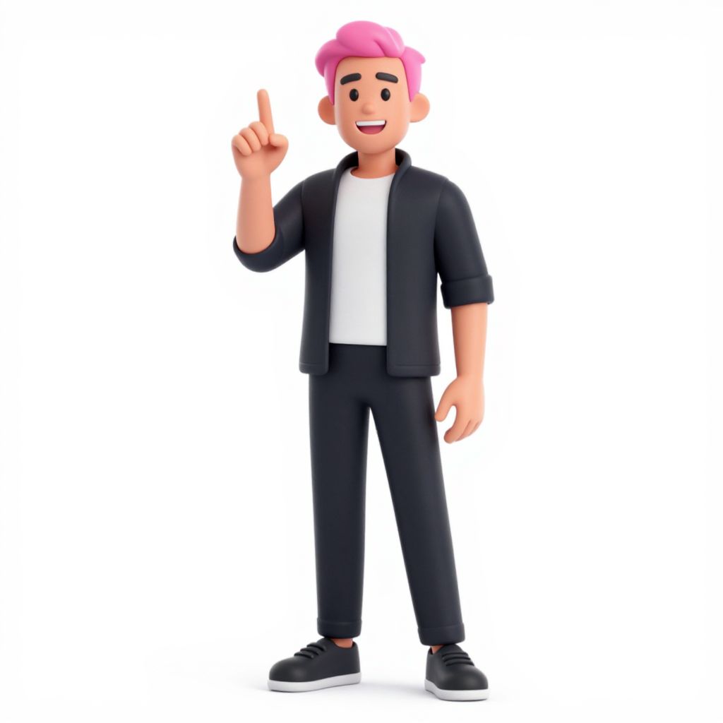 A digital 3D cartoon-style illustration of a young man with pink hair, light skin, and black eyebrows. He wears a black jacket over a white shirt, black pants, and black sneakers. His right hand is raised, index finger pointing upwards, and he has a cheerful expression with a wide smile. The background is plain white, emphasizing the character. The image has a clean, modern, and slightly exaggerated artistic style.