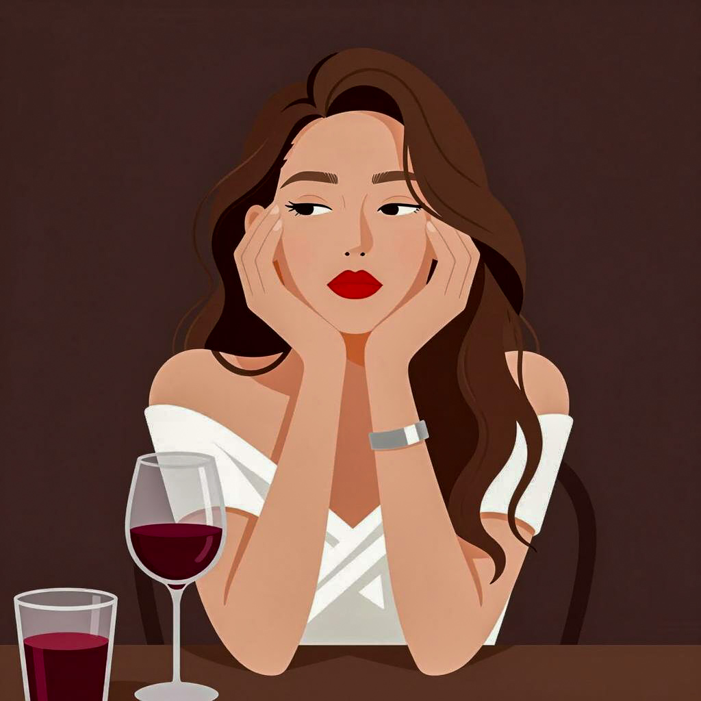 Illustration of a woman with long brown hair and light skin, wearing a white off-shoulder top and a silver bracelet. She leans on her hands with elbows on a table, looking thoughtfully to the side. A glass of red wine and another drink in a short glass are on the table. The background is dark, creating a moody atmosphere.