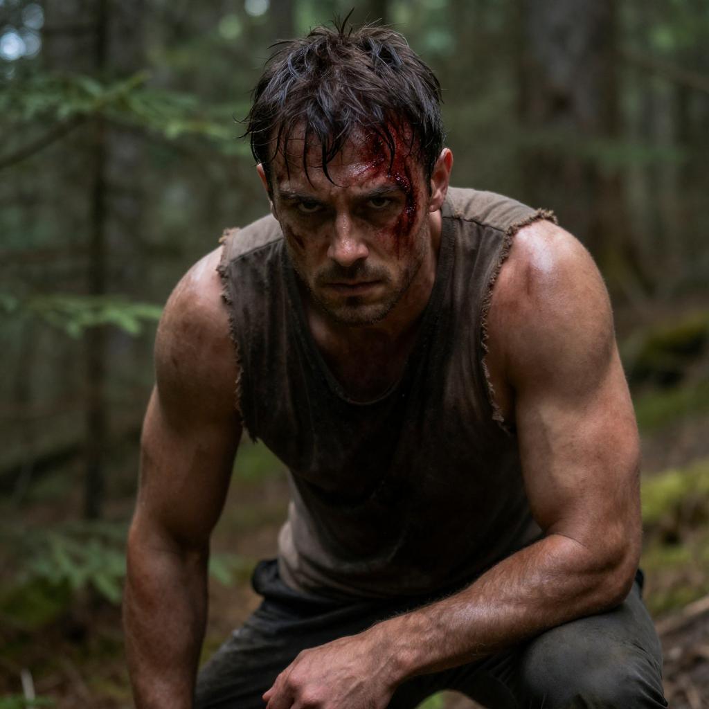 Photograph of a rugged, dark-haired man with blood on his face, holding a large axe in his right hand. He wears a dirty, dark shirt with the collar open, and has a determined expression. The background is blurred and dark, emphasizing his intense gaze and the axe.