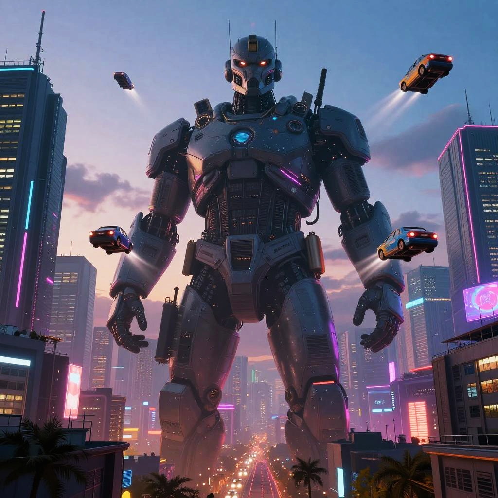 Giant man city scene at dusk, massive figure blending with neon-lit buildings, flying cars zooming between colossal structures, vibrant and surreal cyberpunk atmosphere