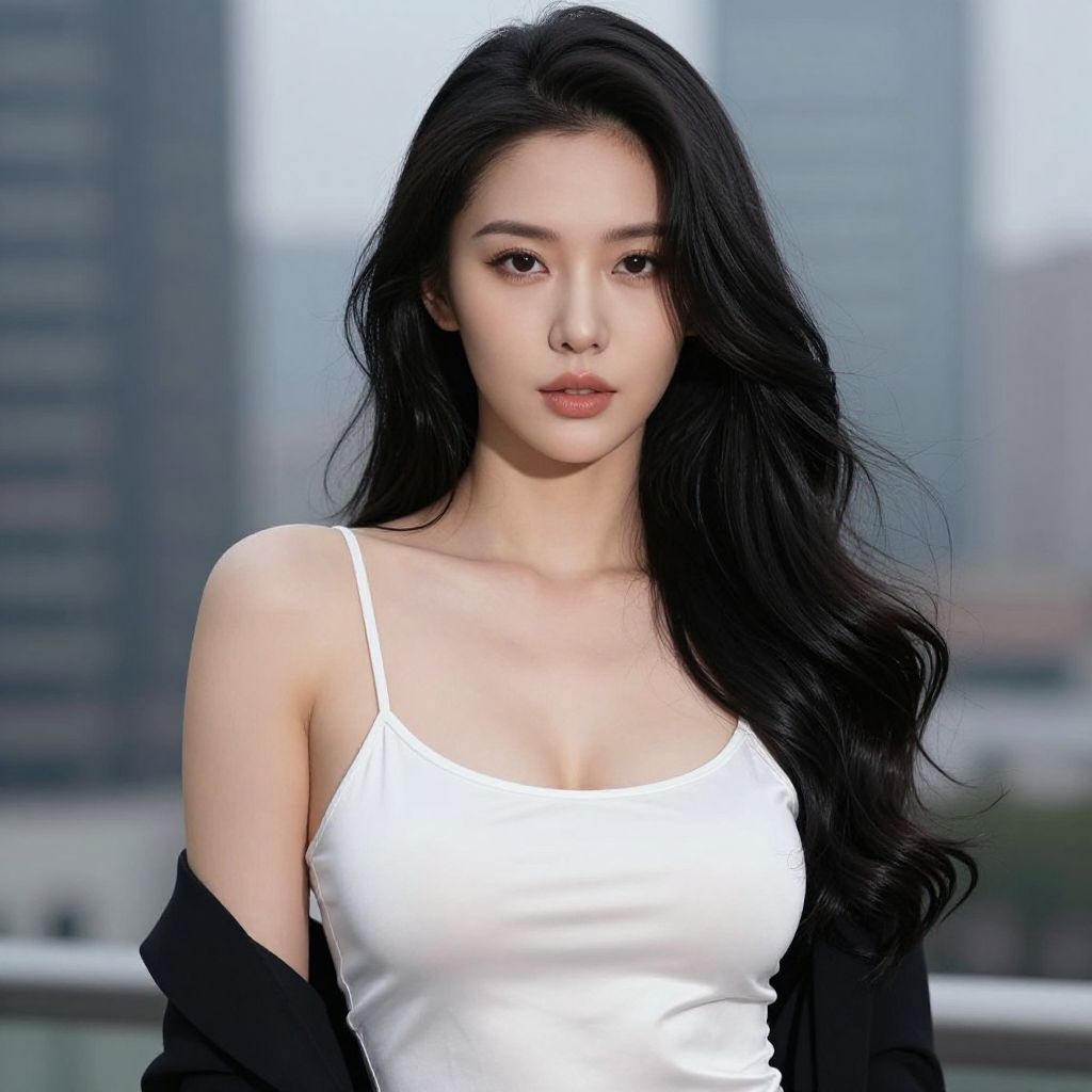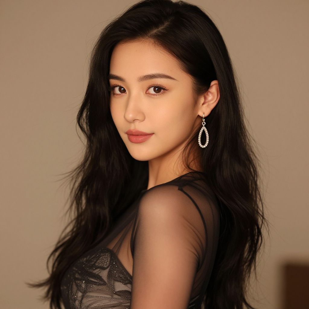 Photograph of an East Asian woman with long, wavy black hair and a yellow flower in her hair. She's smiling gently, wearing a sleeveless, deep V-neck yellow dress with a wrapped waist. She has light skin and is wearing dangling gold earrings. The background is a plain, light gray wall. Her dress and accessories contrast with her dark hair, drawing attention to her face and the bright yellow flower. The image has a soft, natural lighting that highlights her features.