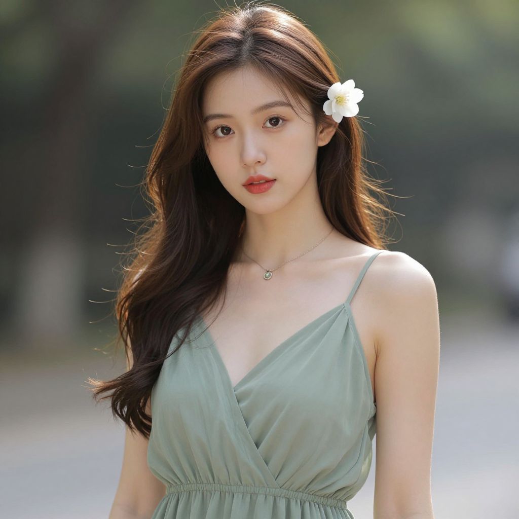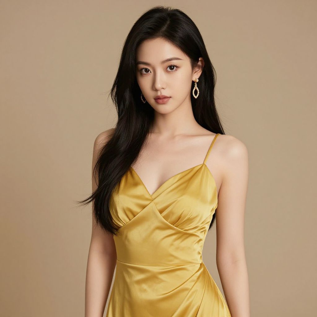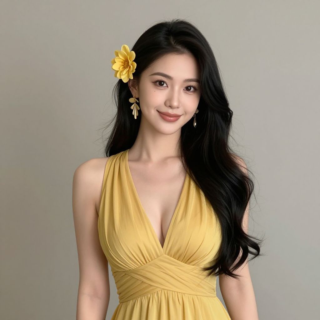 Photograph of an Asian woman with long black hair, yellow flower in hair, wearing a yellow V-neck dress, smiling, light gray background.