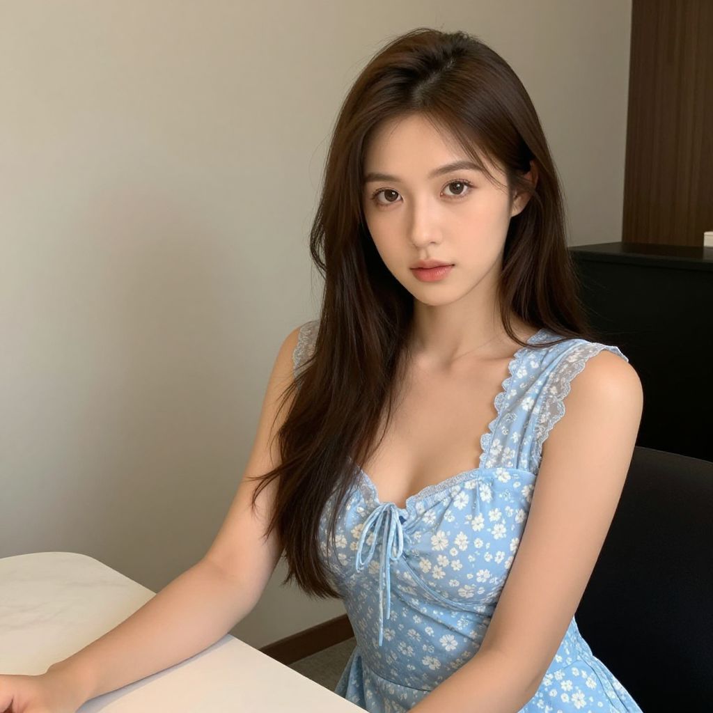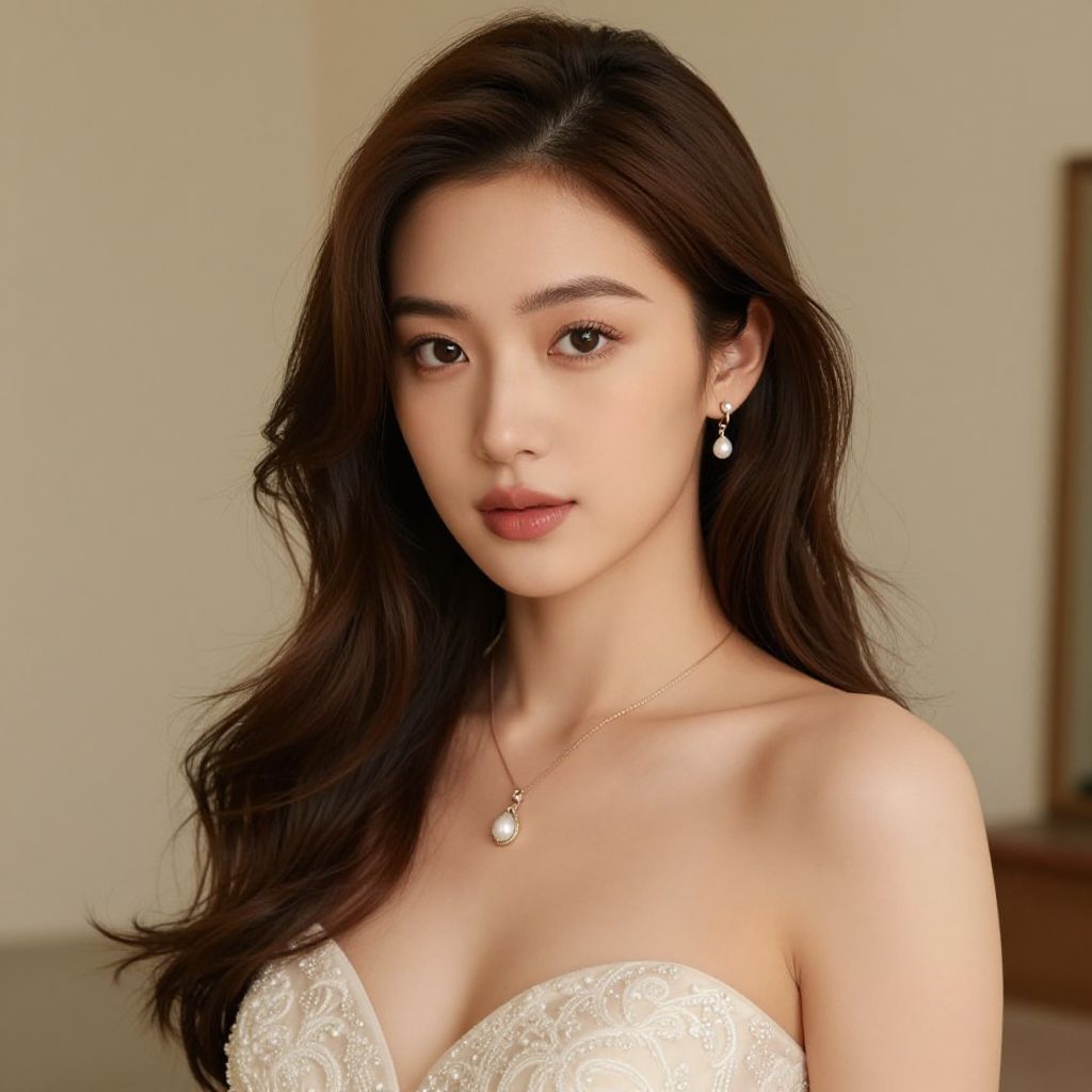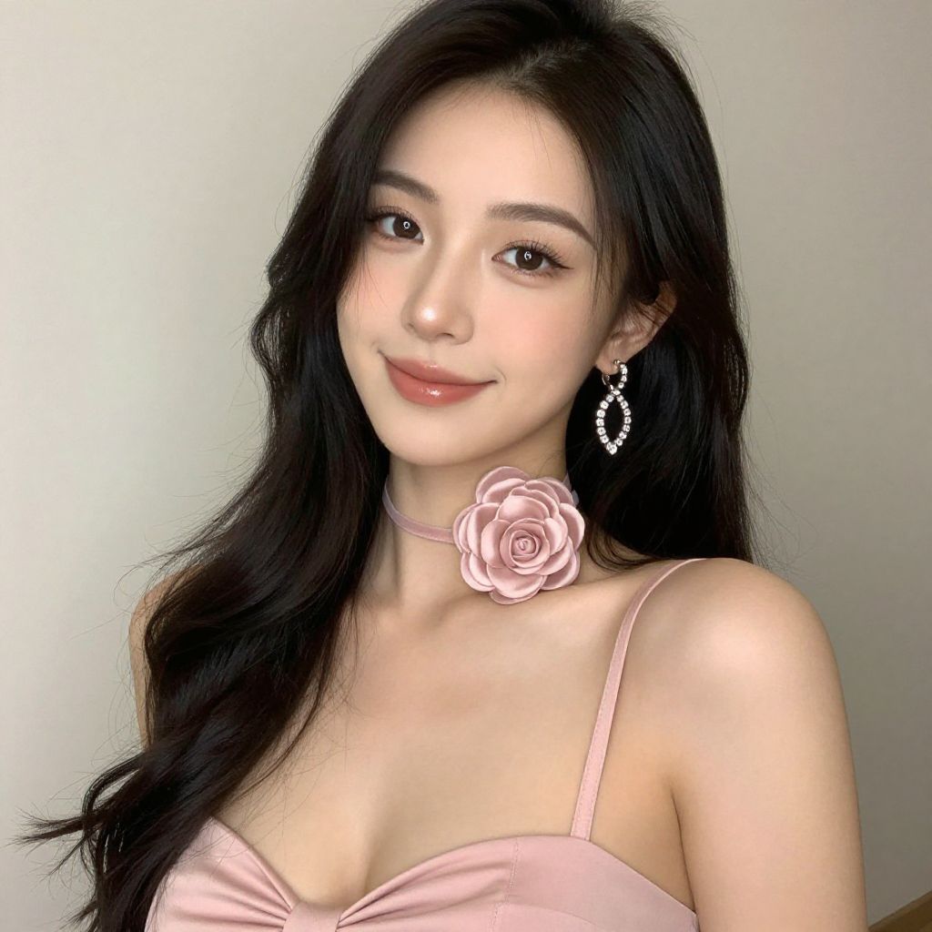 Photograph of an Asian woman with long black hair, yellow flower in hair, wearing a yellow V-neck dress, smiling, light gray background.
