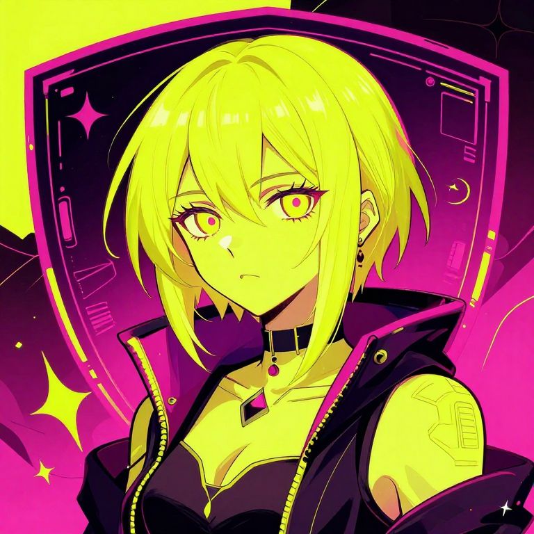 A cyberpunk-themed portrait in neon yellow and pink colors, featuring detailed 2D illustration with a futuristic shield and dark fantasy elements, in a manga anime style.