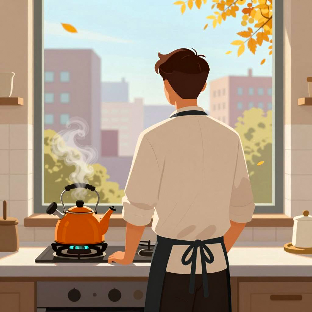 Illustration of a woman with fair skin and red hair in a bun, wearing a yellow top, blue skirt, and a patterned blue headscarf. She sits barefoot on a wooden chair at a simple wooden table by a bright window, holding a steaming cup, with sunlight casting shadows in the room. The background features blue walls adorned with blue and yellow abstract swirl patterns. A small potted plant and a red object rest on the table.
