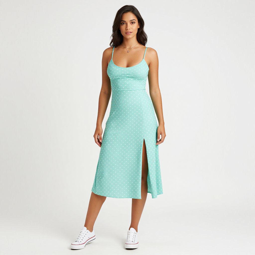 "Woman, casual summer style, mint green midi sundress with white polka dots, scoop neckline, thin straps, fitted bodice, flared skirt with a thigh-high slit, white low-top sneakers, simple pendant necklace, plain white studio background.. Sexy. Pretty face and beаutiful eyes. Big breasts."