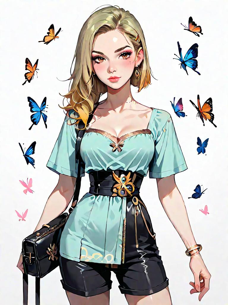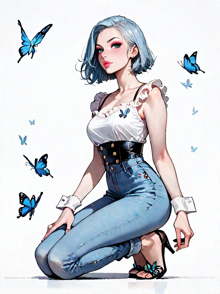 1girl, source_comics, realistic face, full body shot, Woman, casual chic, fitted high-waist light blue jeans, white long-sleeve blouse with butterfly print, square neckline, puffed shoulders, fitted cuffs, clear strap open-toe heels, white background.