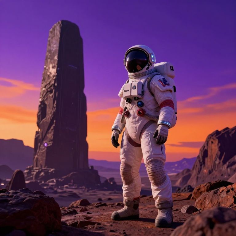 Digital art of a lone white-armored astronaut standing on a rocky hill, gazing at a distant, towering futuristic cityscape under a starry sky
