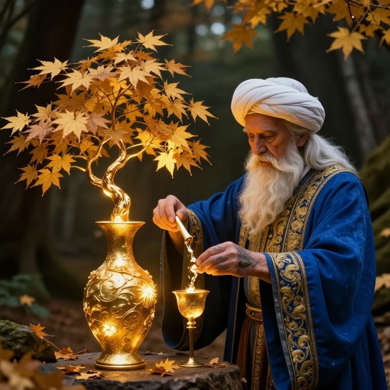 In this captivating 8k fantasy scene, an elderly alchemist, adorned in a rich blue robe with intricate gold embroidery, is engrossed in the art of transmutation. His white beard and turban add to his wise and ancient appearance. He is meticulously crafting gold from a Japanese maple tree, which stands as a symbol of nature's mystical power. The tree, with its twisted branches and autumn leaves, is intricately carved into a vase-like shape, exuding an ethereal glow that illuminates the alchemist's face. The alchemist's hands, adorned with tattoos, are skillfully manipulating a small golden cup, pouring a liquid that transforms the tree into shimmering gold. The scene is set against a dark, forested background, with warm, golden light filtering through the leaves, creating a sense of magic and wonder. The overall composition is balanced, with the alchemist and the tree as the central focus, surrounded by a rich tapestry of textures and colors that enhance the mystical atmosphere.