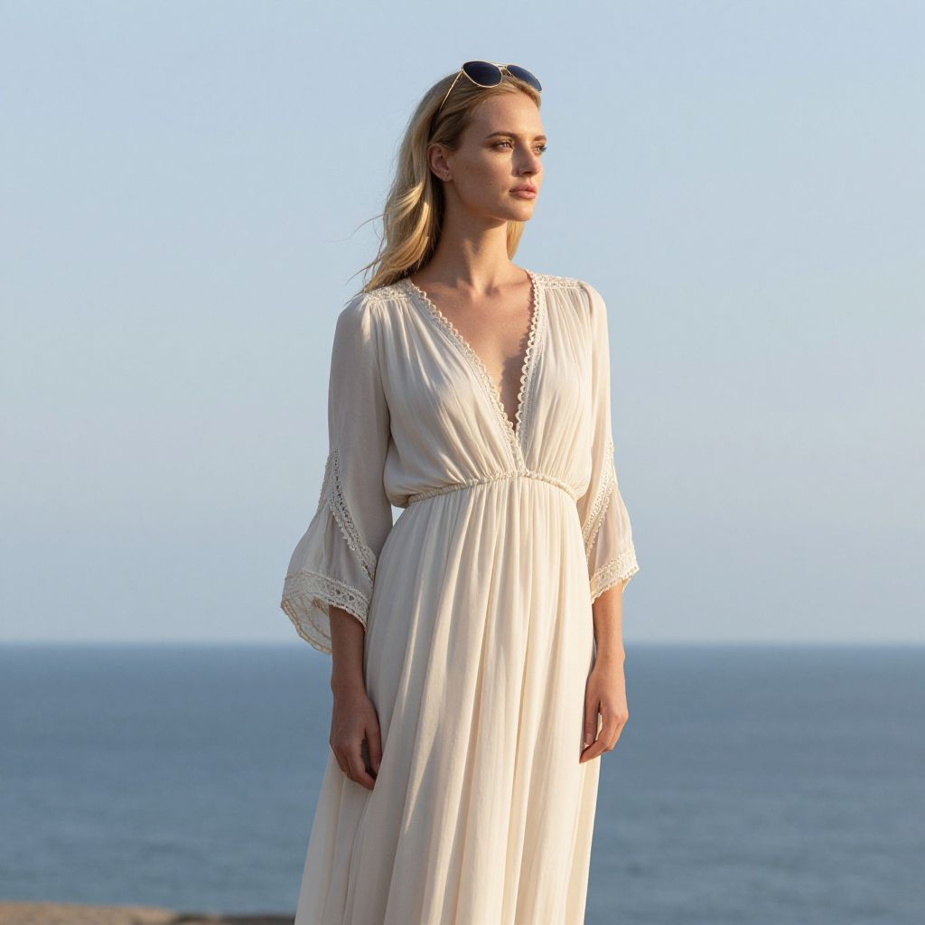 Blonde-haired woman standing gracefully against a serene coastal backdrop, wearing a flowing cream dress with intricate details, her golden sunglasses perched atop her head as she gazes thoughtfully toward the horizon.