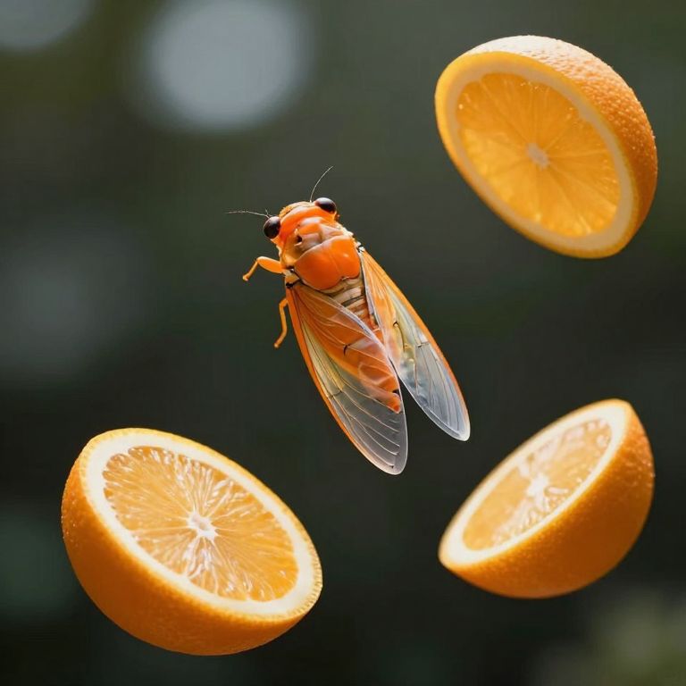 Vibrant orange cicada with translucent crystalline wings hovers gracefully among three floating slices of citrus, its delicate form illuminated by soft, diffused light against a dark, bokeh-filled background.