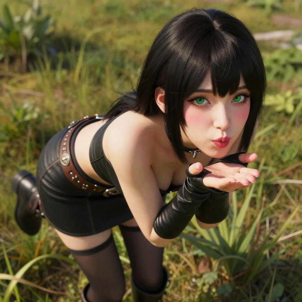 (Masterpiece, High Quality:1.3), stunning hyperrealistic, (3D:0.65), cycle render, trending on cg society, intricate Details, field of view, (sharp focus:0.9), soft egdes, (cinematic lighting:1.1), vibrant colors, Gentiana, mature female, bending over, flying kiss, flirting, blush, grass background, rays and shadows, (outside:1.15), (cowboy shot, very closeup:1.2), black hair, hime cut, blunt bangs, lipstick, makeup, black eyeshadow, eyelashes, (ultra detail hair:1.1), ultra realistic hair, ultra detail face, green eyes, (perfect eyes, perfect face:1.2), japanese clothes, black dress, black skirt, intricate cloth ornament, (pantyhose:1.05), thigh boots, toeless footwear, fingerless gloves, elbow gloves, (Large Breasts:1.2)