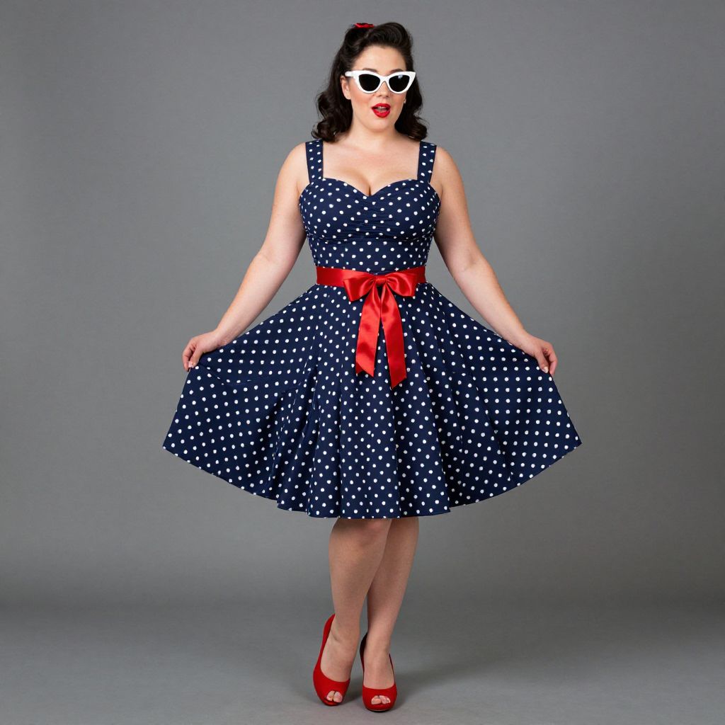Full body shot, Curvy woman, Rockabilly sailor dress, navy blue cotton fabric, white polka dots, sweetheart neckline, wide straps, fitted bodice, flared skirt, knee-length hem, bow detail at waist, red satin ribbon, vintage-inspired, playful and feminine, paired with red peep-toe heels, retro cat-eye sunglasses, red lipstick, nautical theme, classic pin-up style Sexy. Pretty face and beаutiful eyes. Big breasts