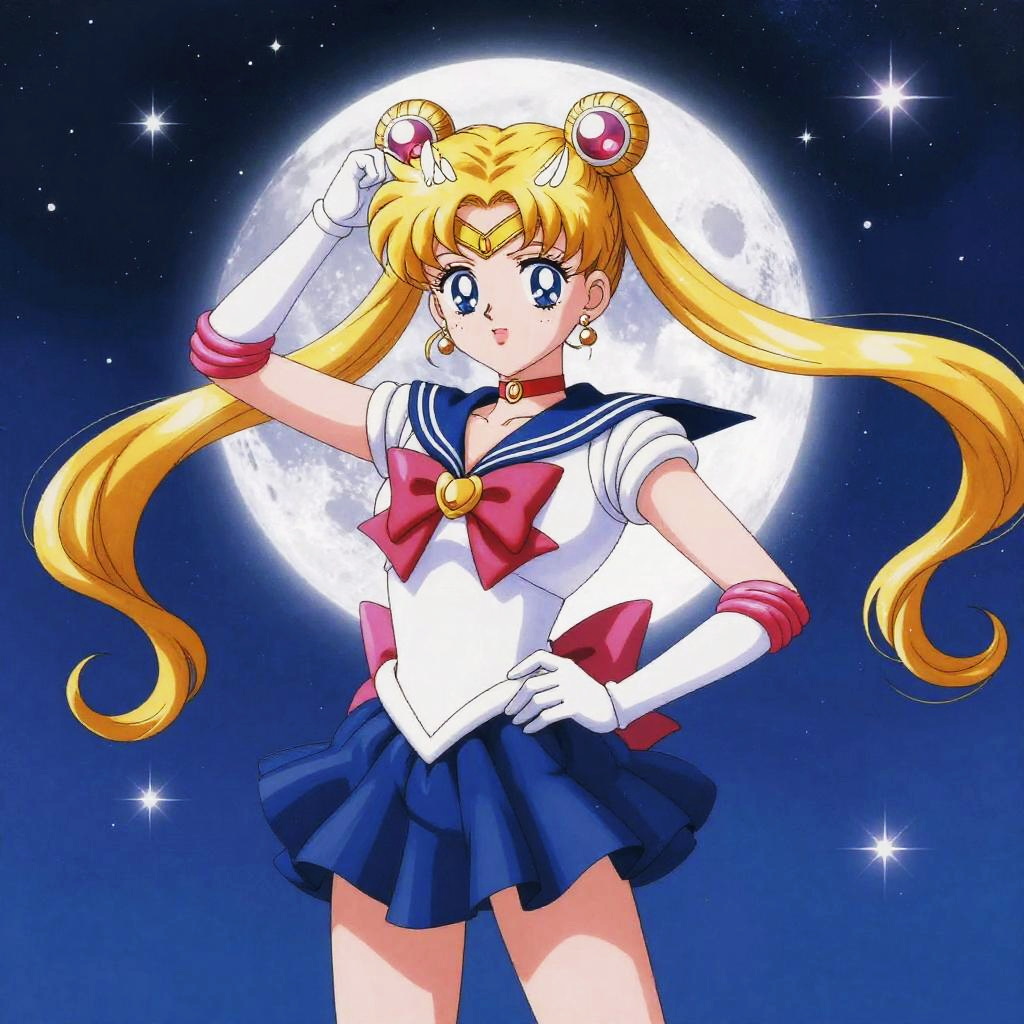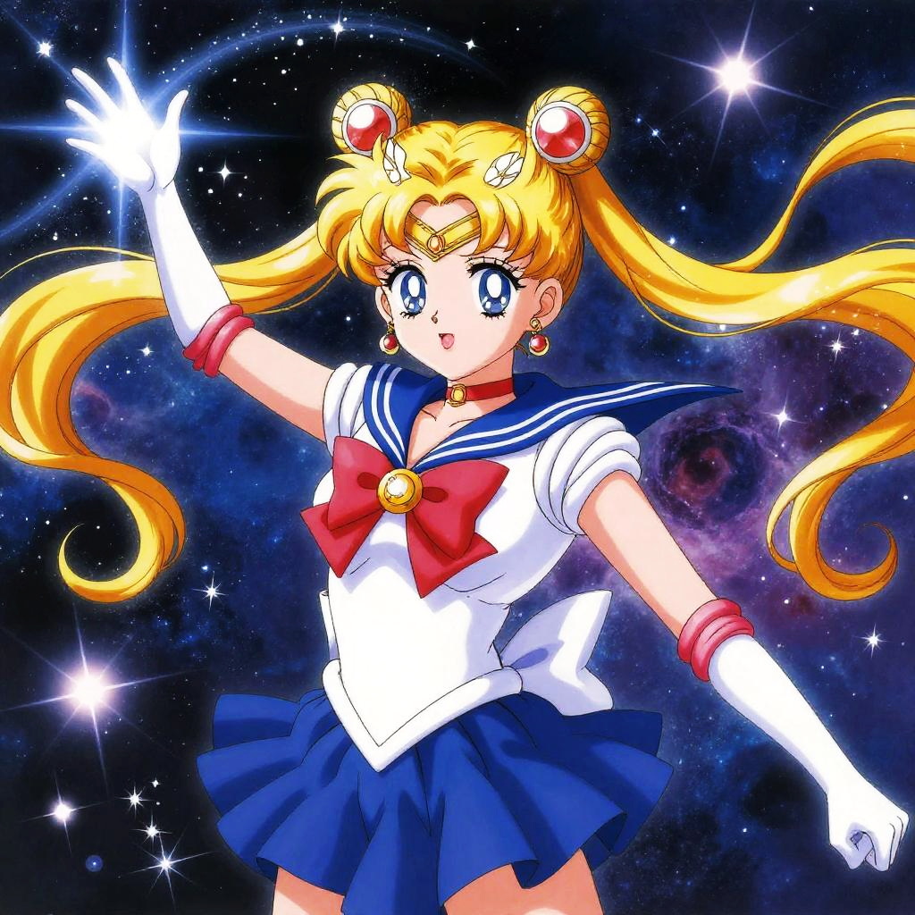 Digital anime-style artwork of Sailor Moon with blonde pigtails, white gloves, blue sailor outfit, red bow, and cosmic starry background.