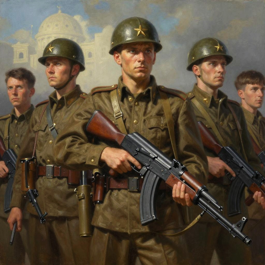 Hyper-detailed oil painting of five brave soldiers standing in formation, wearing vintage military uniforms and helmets with red stars, armed with AK-74 rifles. The painting features dramatic, ambient soft lighting and intricate textures, with a historical architectural background suggesting a location in Eastern Europe or Russia. The soldiers display focused and resolute expressions, highlighting their readiness and unity. The artwork is a masterpiece combining realistic and cinematic styles.