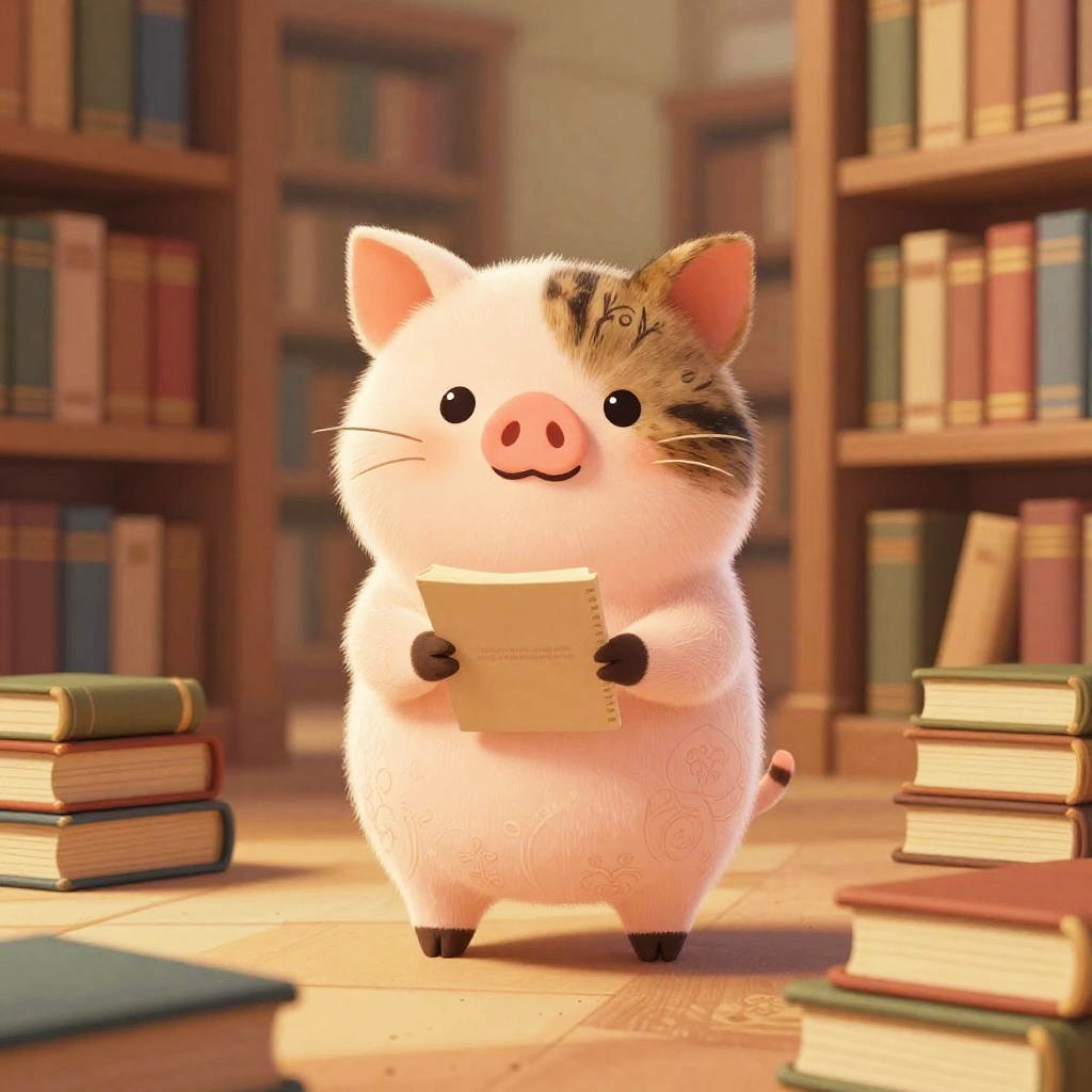 Illustration of a pig cat hybrid exploring a magical library filled with ancient tomes, featuring soft pastel tones, whimsical expressions, and intricate patterns merging pig and cat anatomy