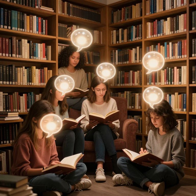 Photograph of four young women with long hair, sitting cross-legged on a wooden floor in a cozy library with wooden bookshelves filled with colorful books. They are reading books, and each has a glowing, spherical light bulb hovering above their head, creating a whimsical effect. The women are dressed in casual clothes: sweaters and jeans. One woman in the center, with straight brown hair and glasses, sits on a brown armchair. The other three women sit on the floor. The warm, soft lighting highlights the library's inviting atmosphere, and the floating light bulbs add a magical, dreamlike quality to the image.