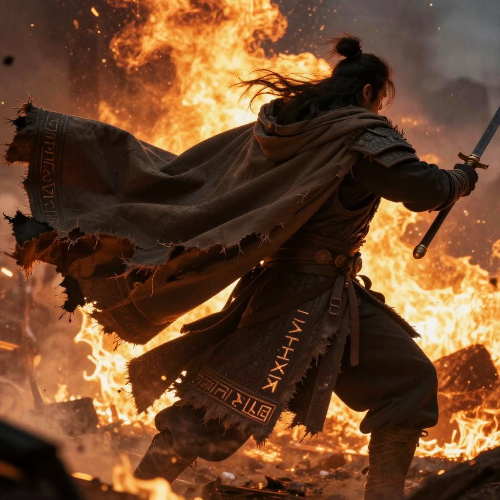 Billowing cloak trailing behind a warrior in mid-battle, tattered edges, heavy texture, glowing runes along the hem, fiery battlefield background, intense and vivid colors.