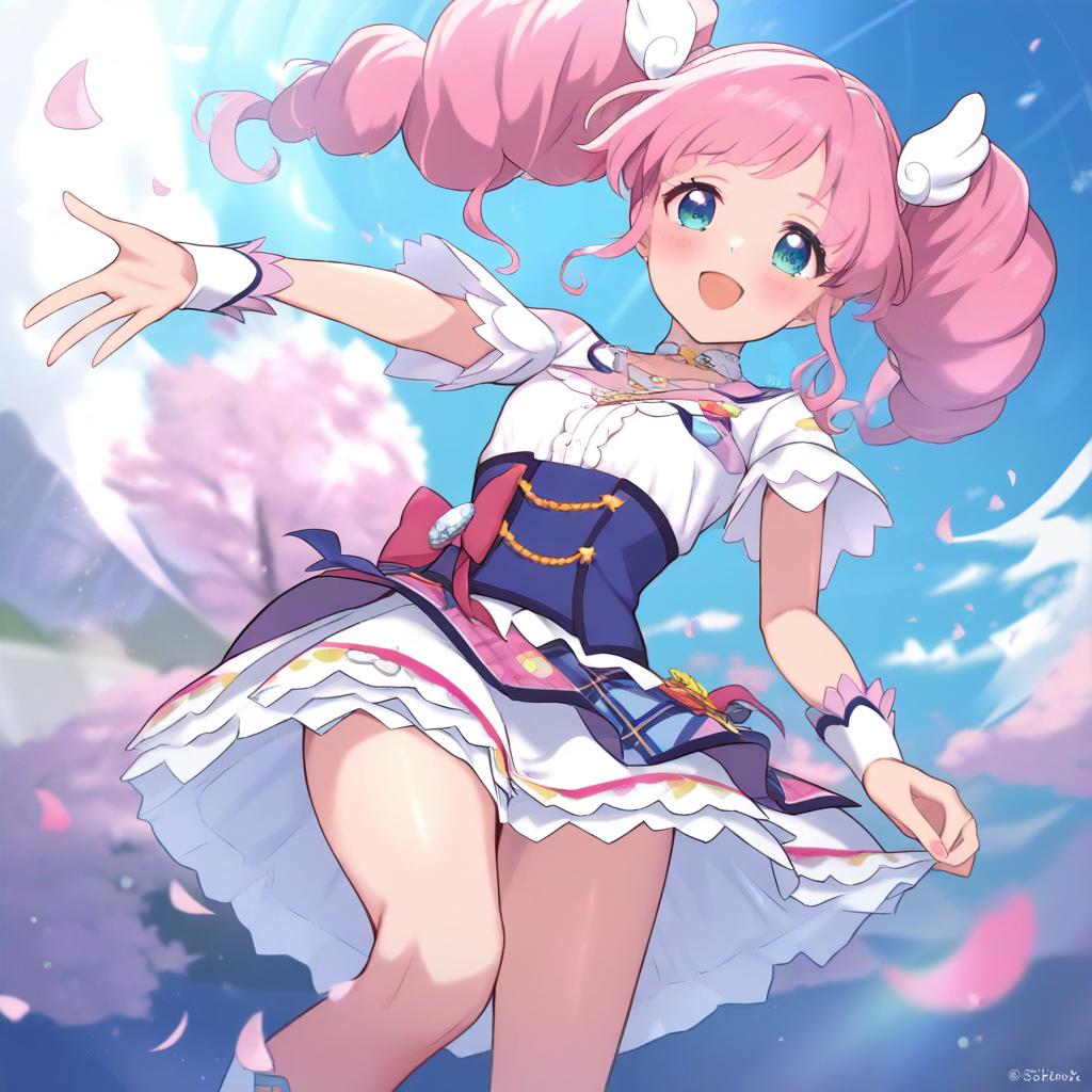 Digital anime-style illustration of a cheerful girl with long pink twintails and blue eyes, wearing a detailed white and blue frilly outfit with decorative accessories. She is standing outdoors with a bright blue sky and cherry blossom trees in the background.