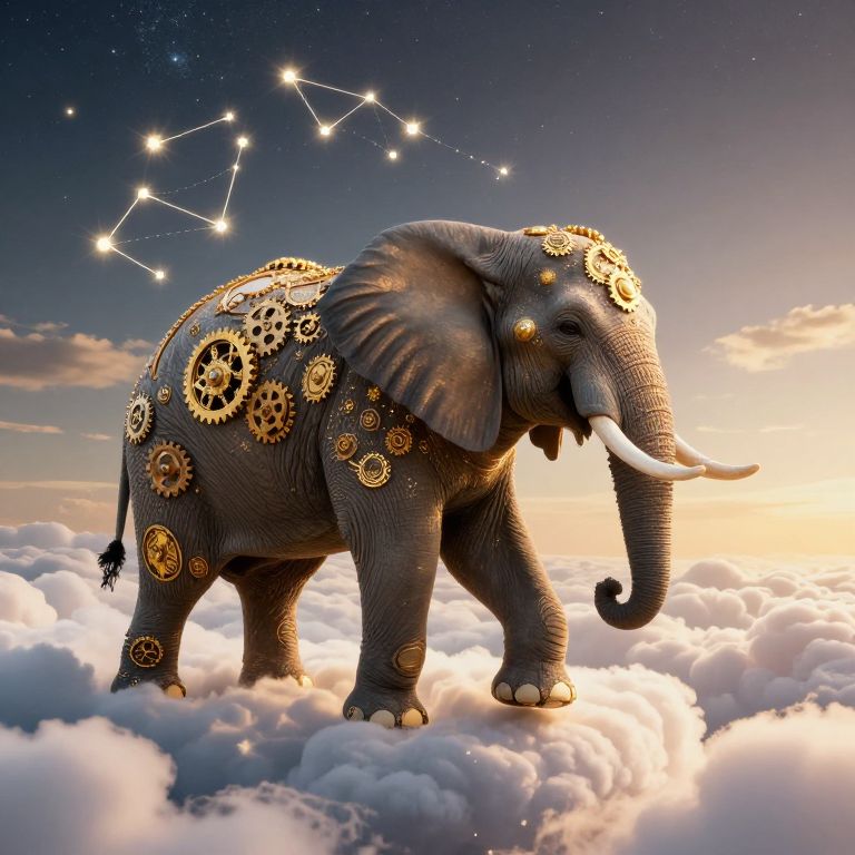 Digital artwork of a grey elephant adorned with golden gears and cogs, standing on fluffy clouds under a starry night sky.
