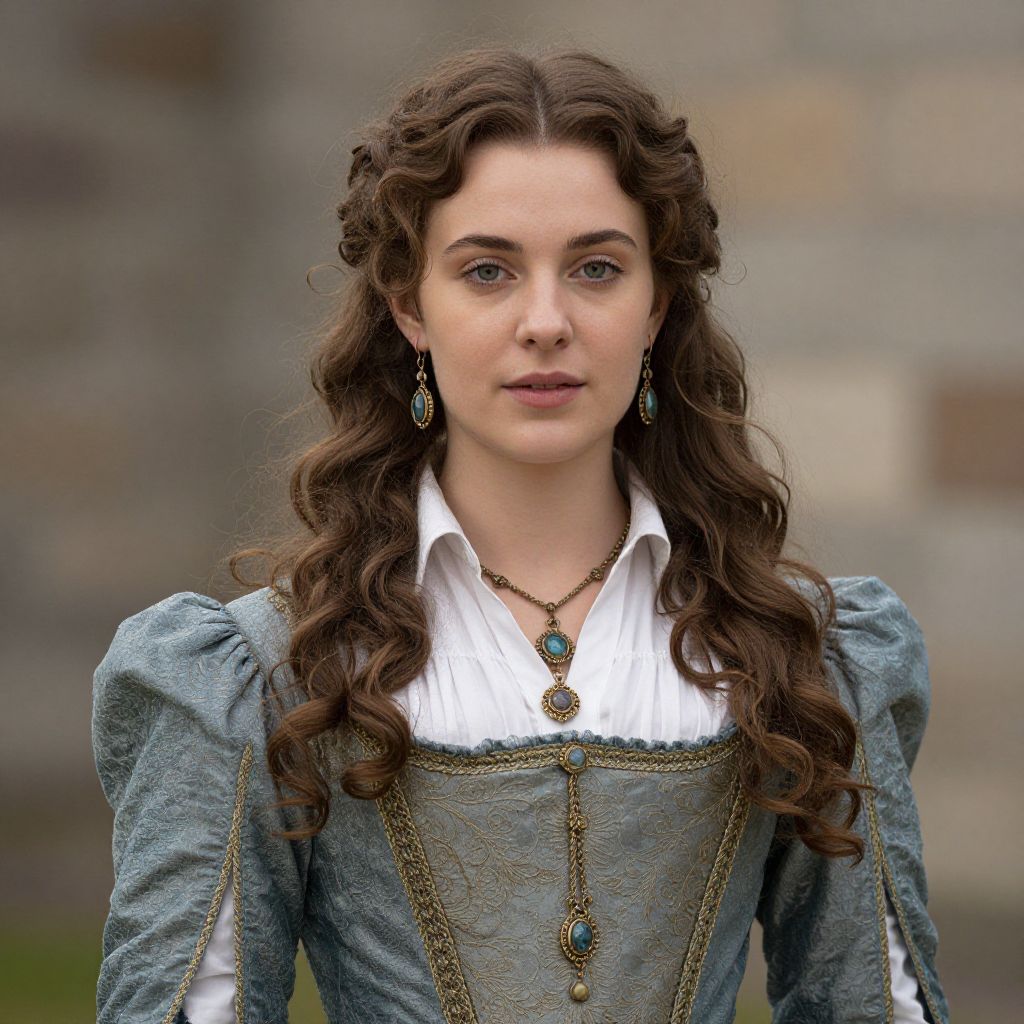 Photograph of a young woman with fair skin and long, wavy brown hair, styled in loose curls with braids on the sides. She has blue eyes and wears a period-style, light blue, textured dress with puffed sleeves and a white, ruffled blouse underneath. The dress is adorned with gold chain details and a pendant necklace. She also wears teal drop earrings. The background is a blurred, gray stone wall, suggesting an outdoor, historical setting. The woman's expression is neutral, and she stands facing the camera.