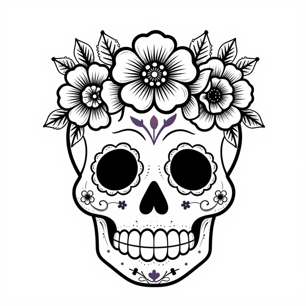 A black and white digital drawing of a sugar skull with floral decorations. The skull has large, hollow eye sockets, a heart-shaped nasal cavity, and a toothy grin. Purple floral patterns adorn the forehead and cheeks. The skull is topped with a wreath of five detailed flowers, each with textured petals and small leaves. The overall style is reminiscent of Day of the Dead (Día de los Muertos) art, characterized by bold, clean lines and a contrast of black and white. The background is plain white.